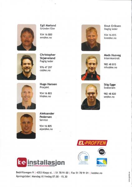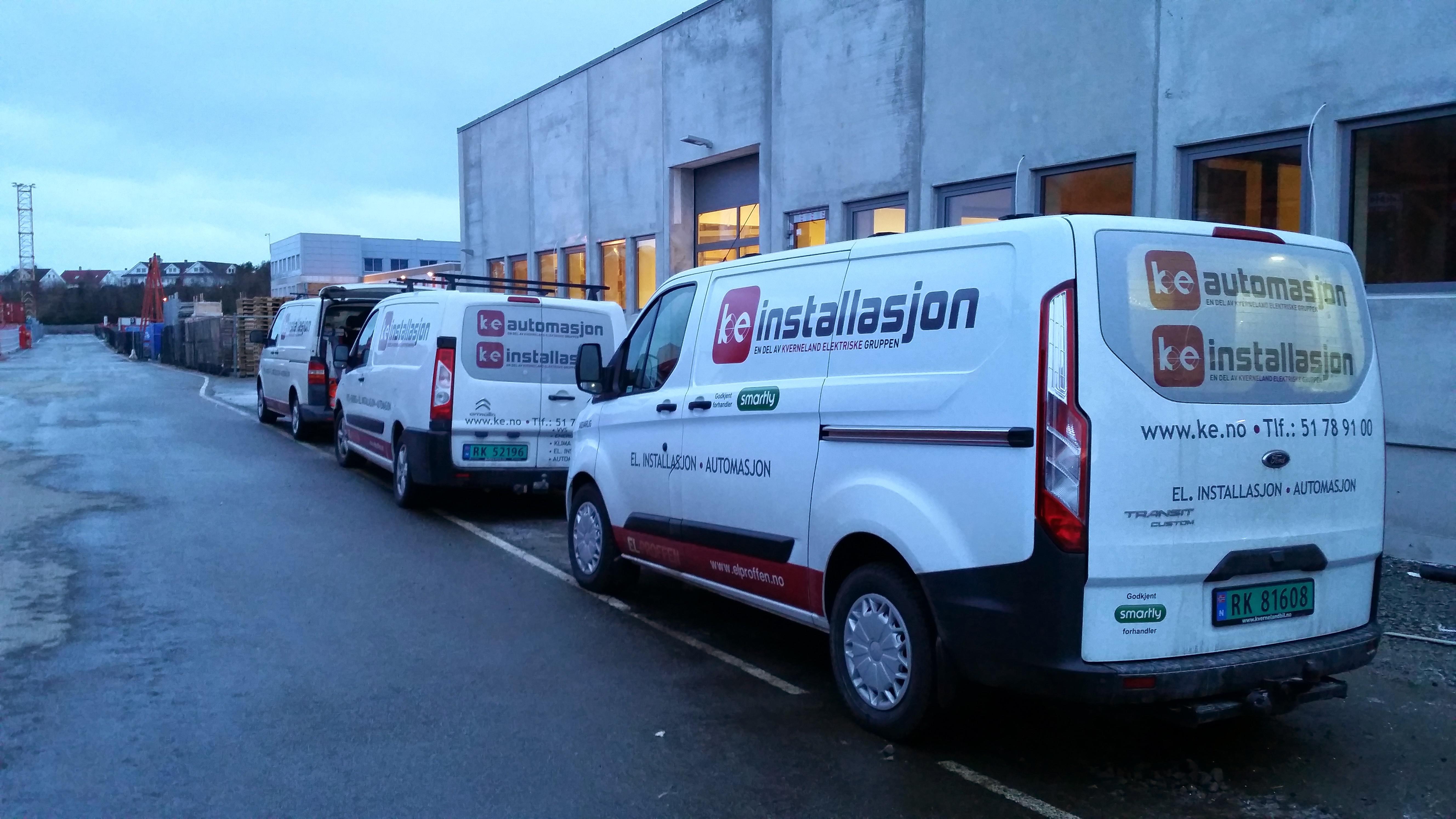 KE installasjon as er utløpt fra Kverneland Elektriske i mars 2014. Da ble dette firmaet delt i to med KE Automasjon og KE installasjon as Begge holder til på Øksnevad i Klepp kommune. Per i dag er det 28 ansatte i selskapet som ledes av Daglig leder Knut Eriksen. Vi driver med elektroinstallasjon i bolig/leilighetsprosjekt for totalentreprenører og utbyggere, rehabiliteringsprosjekt for entreprenører og private kunder og sørvis og vedlikeholdsarbeid for faste kunder i bedriftsmarkedet. I tillegg er vi godkjente leverandører av smartlyproduktenene til Lyse som inngår i en liten, spennende svakstrømsavdeling hvor vi blant annet leverer alarm og adgangskontroll. Vi er også FG godkjent for Interkontroll etter NEK 405 for termografering, kontroll av bolig og næringsbygg. Bedriften er Miljøfyrtårn. Vi har stor fokus på kvalitetsbygging og etikk. Vår bedrift er bygd på verdiene : Ansvar, respekt, ærlig, positiv og faglig utvikling.