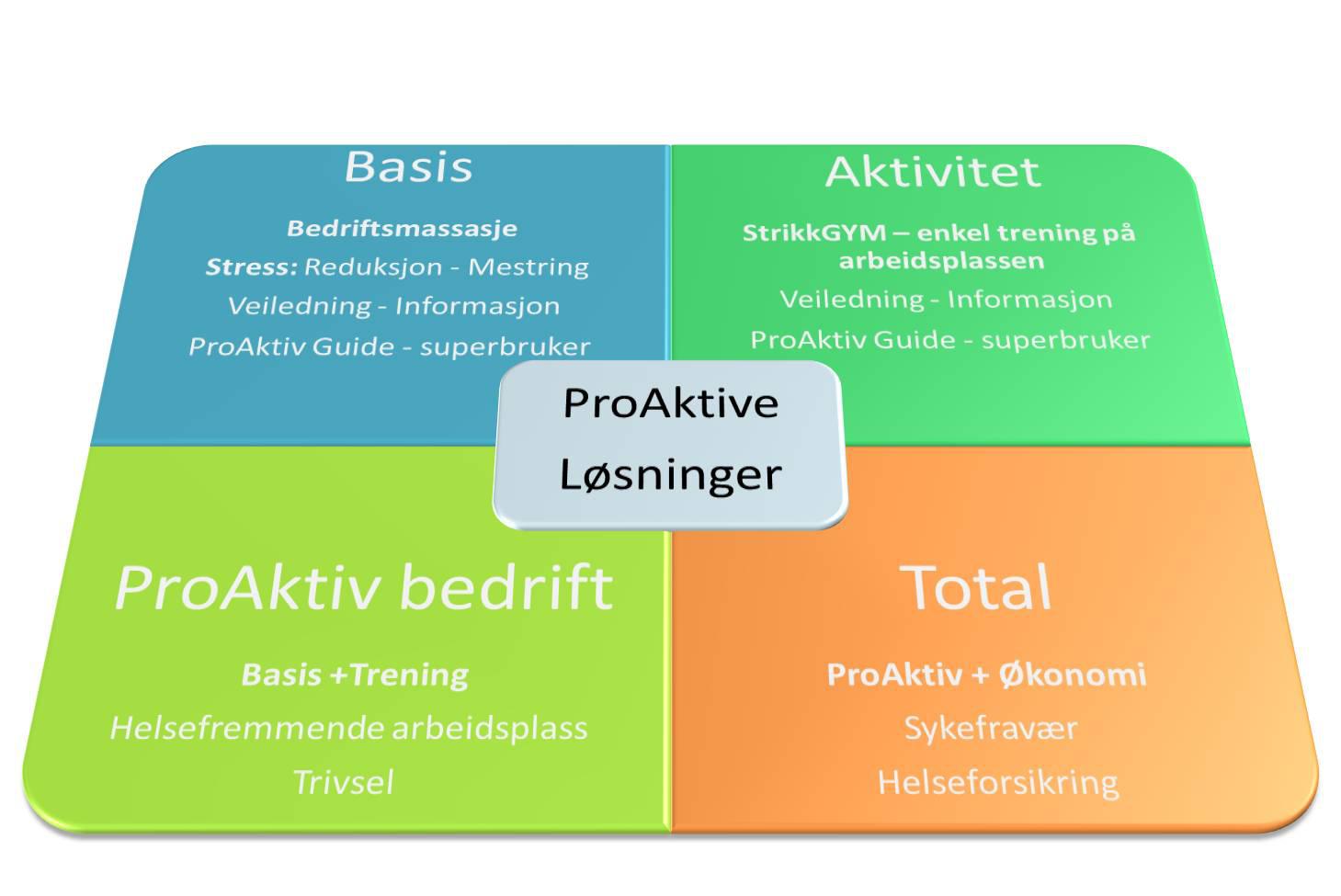 ProAktiv Helse har over 15 års fartstid og er Norges første og ledende innen bedriftstilreisende muskel og ledd behandling samt helhetsmedisinske tilbud. Vi er både en rådgivende og behandlende part og vi utvider hele tiden med tjenester som markedet vil ha. Vårt løfte er at du alltid får utbytte av oss. Våre mange fornøyde kunder velger oss fordi vi har helhetsperspektiv, tenker helsefremmende på både medarbeider og ledernivå. Våre metoder er mange innen både helsefremmende, forebyggende og terapeutisk nivå. Det er en selvfølge men vi holder VIRKELIG kunden i fokus, og strekker oss langt for å finne gunstige løsninger. Vi arbeider med sykdom og symtomer som stammer fra : Negativt stress, kosthold, innaktivitet, mentale uvaner og holdninger, samt organisatoriske forhold som ledelse, arbeidsmiljø og organisering. Kjente symptomer hos individ er: Stress, smerter i mage, muskler og ledd, hodepine, ryggvondt, lite energi og slapphet, mye tretthet, svingende humør, frustasjon, angst, selvbebreidelse, dårlig selvtillit og selvfølelse, dårlig tid.