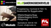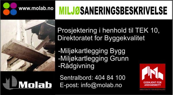 Molab har sentral godkjenning kl 3 for ansvarsrett innen prosjektering, og utfører miljøsaneringsbeskrivelse etter TEK 10 etter Direktoratet for Byggekvalitet. Vi tilbyr kartlegging av miljøfarlige materialer i bygninger, med prøvetaking, analyse, rapportering og rådgivning. Hvis ønskelig kan oppdragsgiver utføre prøvetakingen selv. Asbest, PCB og ftalat og tungmetaller er de vanligste analyseparametrene i byggprøver. Vi har høy fokus på korte leveringstider! Andre aktuelle områder er: Ved salg og kjøp av eiendommer, vil Molab kunne utføre tilstandsklassifisering av forurenset jord og sammenligne med veileder fra miljødidirektoratet. Molab kan dersom det er ønskelig være kundens forlengede arm i miljøspørsmål / prosjekter. Akkreditert prøvetaking vedr. utslipp til luft og miljømålinger Materialtesting - Forurenset grunn - Arbeidsmiljø - Inneklima-Lukt