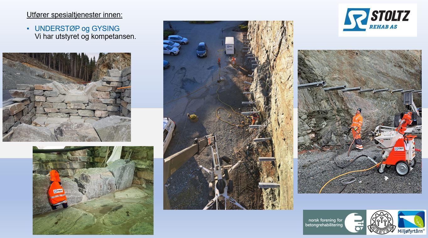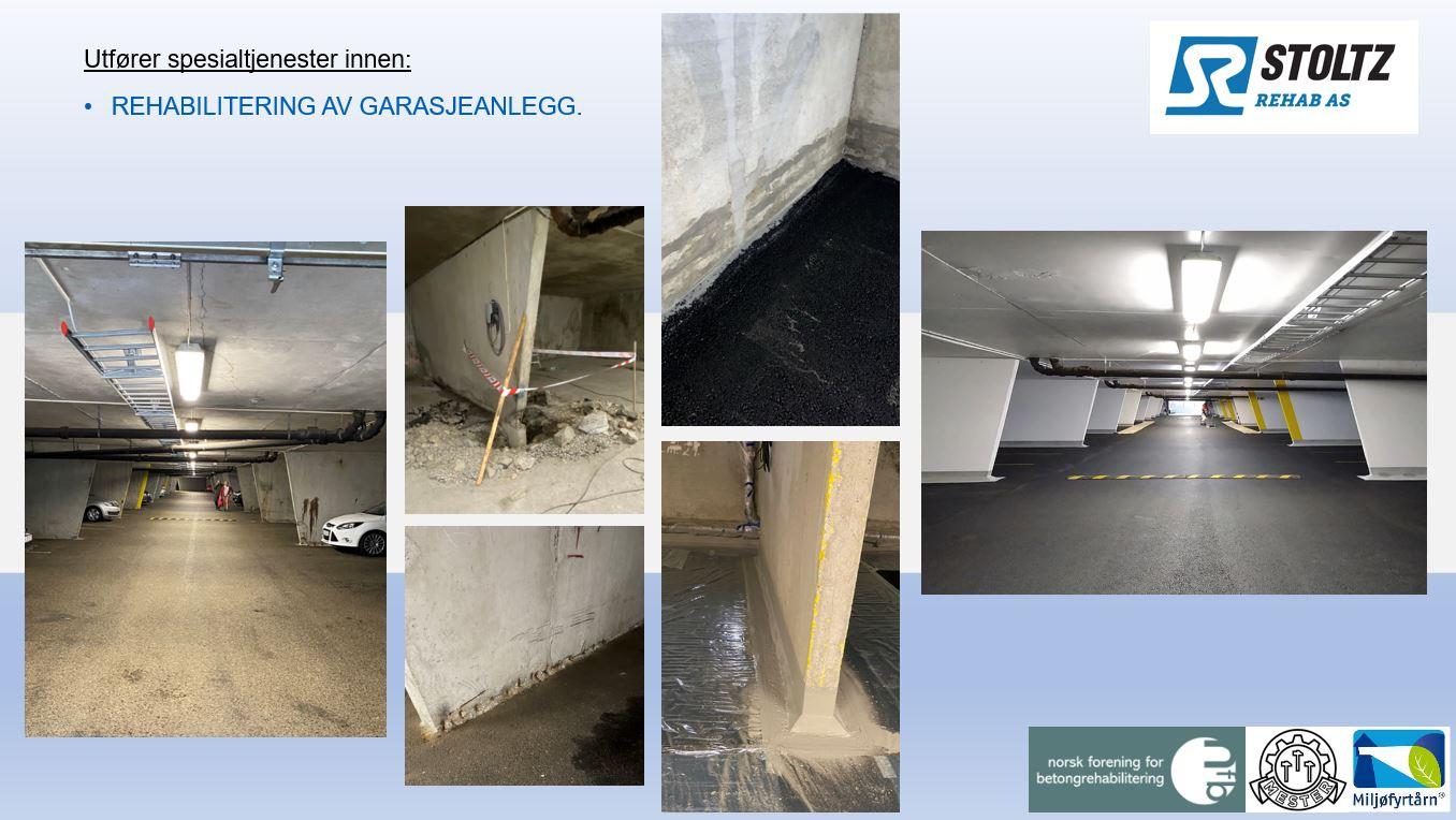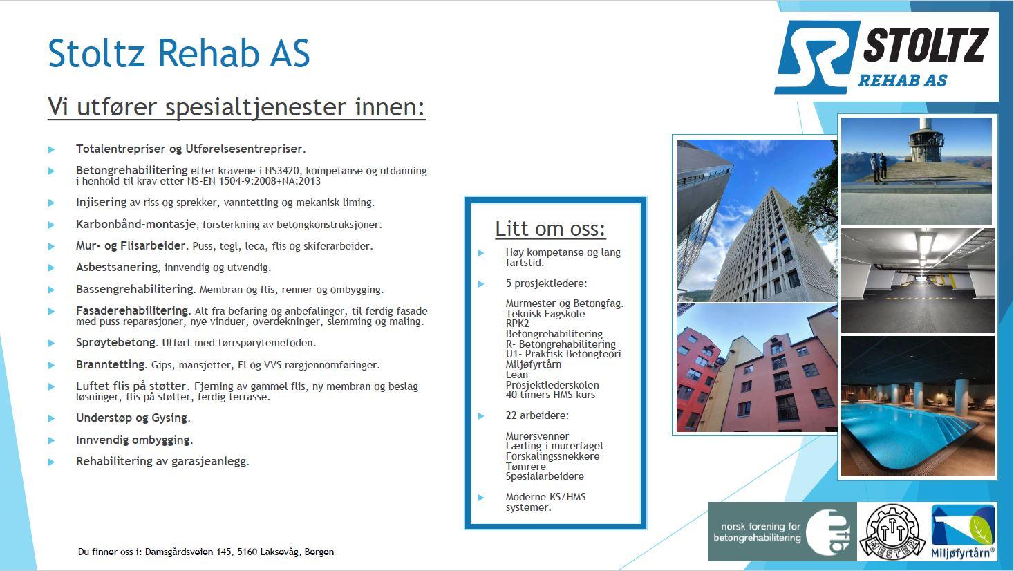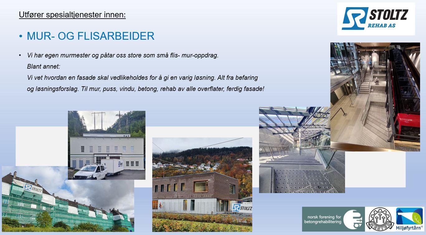 Totalentrepriser og Utførelsesentrepriser. Betongrehabilitering etter kravene i NS3420, kompetanse og utdanning i henhold til krav etter NS-EN 1504-9:2008+NA:2013 Injisering av riss og sprekker, vanntetting og mekanisk liming. Karbonbånd-montasje, forsterkning av betongkonstruksjoner. Mur- og Flisarbeider. Puss, tegl, leca, flis og skiferarbeider. Asbestsanering, innvendig og utvendig. Bassengrehabilitering. Membran og flis, renner og ombygging. Fasaderehabilitering. Alt fra befaring og anbefalinger, til ferdig fasade med puss reparasjoner, nye vinduer, overdekninger, slemming og maling. Sprøytebetong. Utført med tørrspørytemetoden. Branntetting. Gips, mansjetter, El og VVS rørgjennomføringer. Luftet flis på støtter. Fjerning av gammel flis, ny membran og beslag løsninger, flis på støtter, ferdig terrasse. Understøp og Gysing. Innvendig ombygging. Rehabilitering av garasjeanlegg.